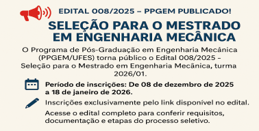 O Programa de Pós-Graduação em Engenharia Mecânica (PPGEM/UFES) torna público o Edital 008/2025 – Seleção para o Mestrado em Engenharia Mecânica, turma 2026/01.